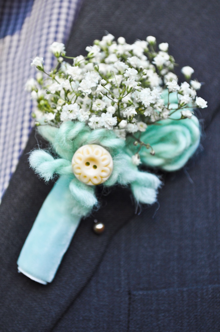 Adorable boutonniere made with a velvet stem wrap, yard and a button as featured on Wedding Chicks