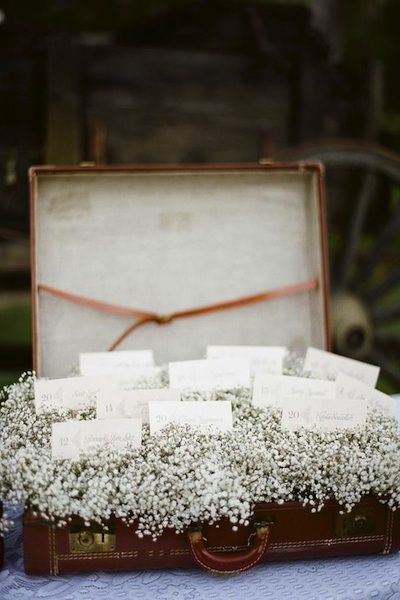 Baby’s breath escort cards display in a vintage suitcase by Intimate Weddings
