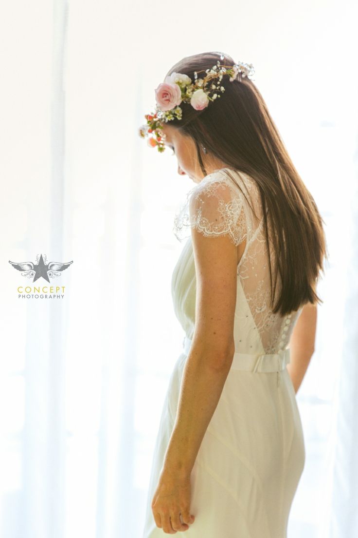 Tickled Pink Bride Ali wearing a floral crown by Suzanne Nichols Design